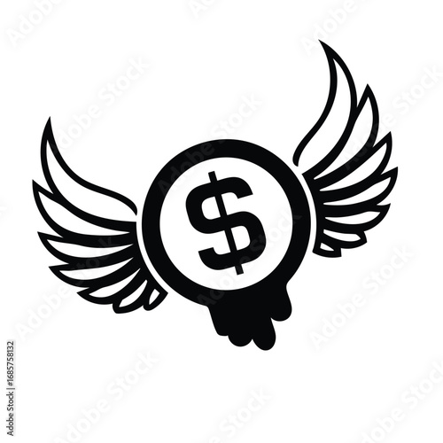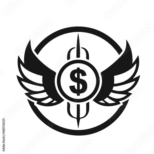 "Winged Dollar Icon – Black and White Vector Symbol Representing Financial Freedom, Economic Mobility, and Investment Growth – Featuring Stylized Wings, Arrows, and Circular Frame – Ideal for Fintech