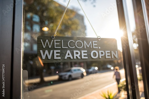"Open" on cafe or restaurant hang on door at entrance.