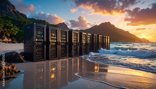 "Data Servers on a Beach at Sunset"