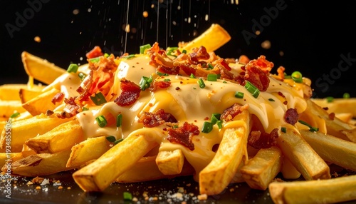 "Showcase indulgent loaded fries topped with melted cheese, crispy bacon bits, and fresh green onions."