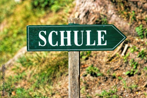 "Schule" - colorful school direction sign in German language- selective focus.