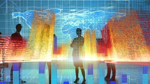 Animation of 3d building structures over silhouette of businesspeople against world map
