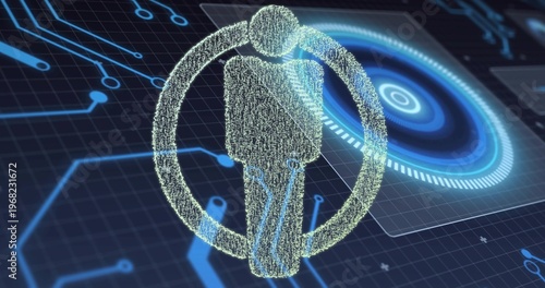 Glowing holographic silhouette hovering inside circular ring above dark grid, showing blue UI