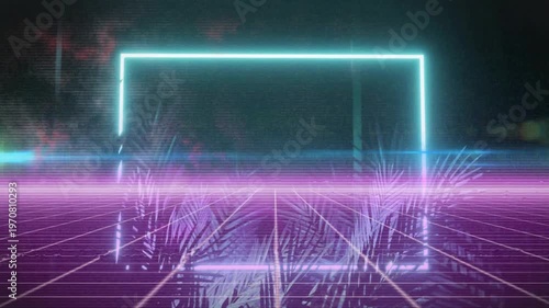 Cyan rectangle fading above grid, magenta scan line sweeping and revealing humanoid for tech