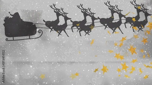 A black silhouette of santa claus in a sleigh being pulled by reindeers against a white background