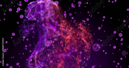Forming humanoid silhouette using glowing particles, bokeh discs, magenta orange glow in dark void