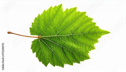 "Close-up of single green grapevine leaf with serrated edges, palmate shape, prominent central vein, and reddish stem, showcasing botanical detail and natural texture."