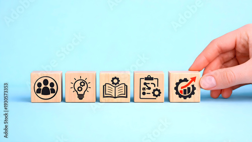 "A hand completes a row of wooden blocks marked with icons for teamwork, innovation, learning, planning, and growth, placing the final progress block to symbolize innovation and constant change."