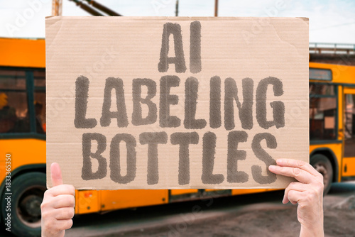 "AI Labeling Bottles" Machines affix stickers to containers ensuring proper alignment consistently. LABEL. BOTTLE. STICKER. ALIGN. APPLY.
