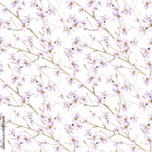 Seamless watercolor pattern with beautiful spring cherry blossoms. The hand-painted drawing is made in the form of light pink flowers on graceful tree branches. This is a romantic floral illustration