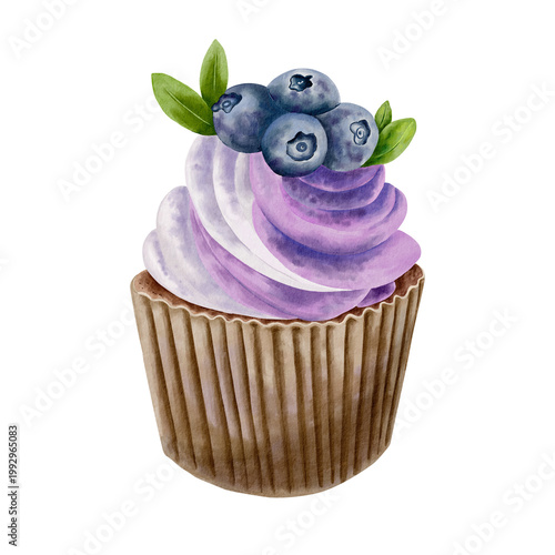 Watercolor blueberry cupcake with cream and fresh berries isolated on white background. Sweet dessert illustration. Perfect for menu, packaging, bakery and food design.