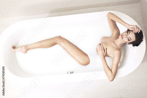 unrecognizable caucasian woman take shower foam flows down the slim stomach slim female with athletic body take a bath