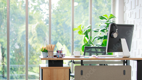 Modern office desk for online work with laptop display, headphone and accessories of note, pen for creative idea recording with coffee cup