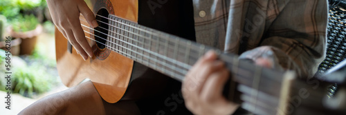 Happy young Woman hands playing acoustic guitar musician alone compose instrumental song lesson on playing the guitar
