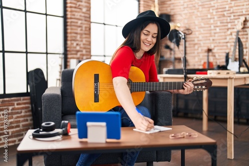 Young woman musician composing song at music studio