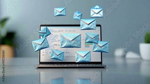 Laptop with multiple email icons floating above the screen, symbolizing communication and digital correspondence.