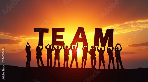 Teamwork concept: People connect with each other and hold letters to compose the team word at sunset. 3d Illustrations