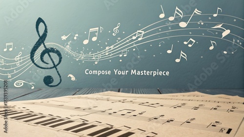 Music sheet with floating musical notes in artistic style