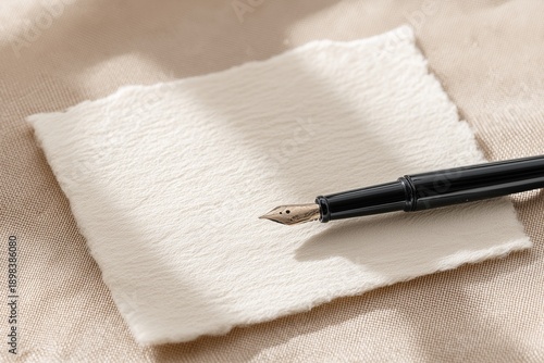 Black fountain pen on textured off-white paper, clear shadows, and negative space for designer flexibility, funeral concept
