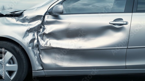 A silver car shows significant damage on the side, featuring a dented door and scratches along the panel, taken from a side angle during daylight