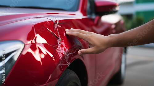 Driver hand examining dented car with damaged fender parked on city street side. Road safety and vehicle insurance concept