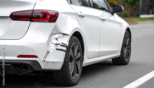 Dented white car rear, damage visible, showing crumpled metal panel and taillight. Close up view on a street