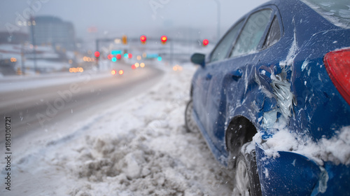Damaged vehicle on icy road, rear dented and crumpled, snow piled around tires, traffic lights reflecting on wet surfaces, cold outdoor winter scene