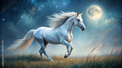 "Gib white horse gallops across a moonlit meadow, mane flowing in the wind, hooves leaving trails of shimmering stardust."