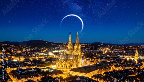 "Celestial arc glowing above Vienna Cathedral at night, surrounded by warm city lights and distant mountains—evoking mysticism, grandeur, and cosmic alignment."