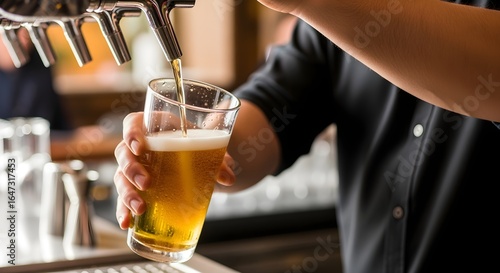 "Bartender pouring draft beer into a chilled glass, shallow depth of field"