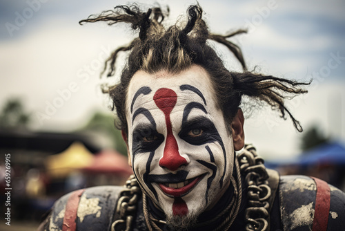 "Portrait of a Juggalo in Detailed Makeup: Authentic Representation of Insane Clown Posse Fan Culture, Perfect for Halloween, Events, and Music Enthusiasts