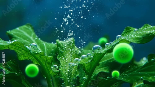 Bubbles rise from vibrant green aquatic plants. Lush underwater foliage thrives in clear blue water.