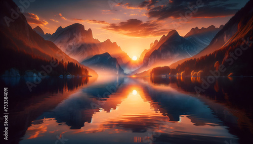 Serene lake sunset with mountain reflections, embodying romanticism in natural light and soft shadows. A tranquil and inviting scene. Generative AI.