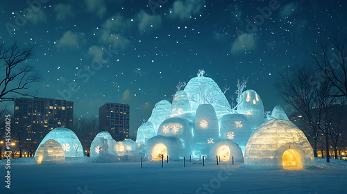 "A picturesque panorama of the Sapporo Snow Festival, featuring a lineup of intricately designed snow sculptures illuminated against a starry night sky,