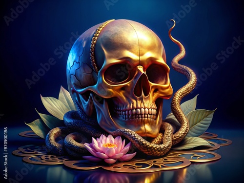 "Surrealistic illustration of a cadaver's innards unwinding like a golden serpent from a serene, lotus-adorned cranium against a midnight blue background."