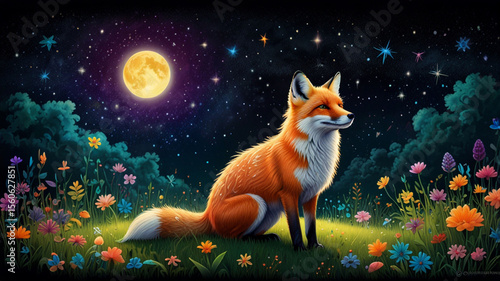 "Fantasy Fox Under Moonlight in a Magical Flower Field" A beautiful digital illustration of a red fox sitting gracefully in a colorful flower field under a glowing full moon and starry sky. This whim